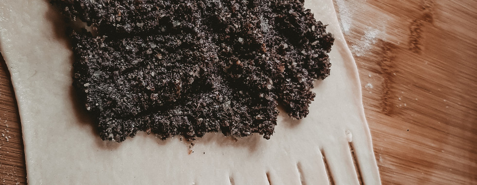 Kugel ausrollen und die obere Hälfte mit der Mandel-Mohnfülle gleichmäßig bestreichen.