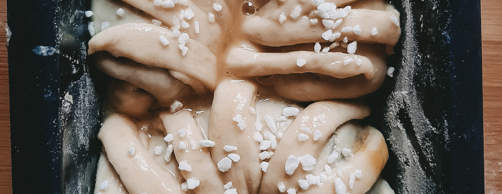 Den Rand (2cm) einklappen und zu einer festen Rolle einrollen und in eine bemehlte Kastenform legen.